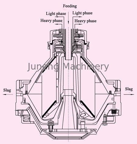 Os materiais não filtrados (líquido misturado) são transmitidos às peças do coração desta máquina (o interior do cilindro). Sob as ações da força centrífuga forte, os materiais passarão embora os intervalos de um grupo de pacotes da parte do disco. E então, o furo neutro da parte do disco que é a relação, o líquido com densidade mais alta (fase pesada) moverá para fora o furo neutro ao longo da parte do disco, fluindo à grande bomba centrípeta. Os resíduos pesados serão acumulados na área do sedimento, esperando a descarga fora da máquina. O líquido com mais baixa densidade (fase clara) mover-se-á para dentro e para cima ao longo da parede da parte do disco e recolher-se-á na bomba centrípeta pequena. A fase pesada e a fase da luz outputted pela grande bomba centrípeta e pela bomba centrípeta pequena respectivamente.