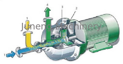 Dois (ou mais) líquidos misturados quantitativa são alimentados à entrada e participam no cilindro, são inteiramente misturado devido à força centrífuga e às 6 cavidades no cilindro, a bomba centrípeta na tomada converte a cabeça de pressão dinâmica do líquido que gira na alta velocidade na cabeça de pressão estática (0.10~0.2MPa) e envia-a à operação seguinte.